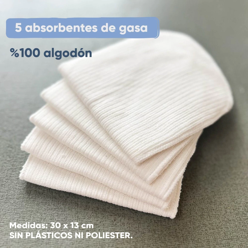 - 5 absorbentes de gasa: 100% algodón sin plásticos ni poliéster