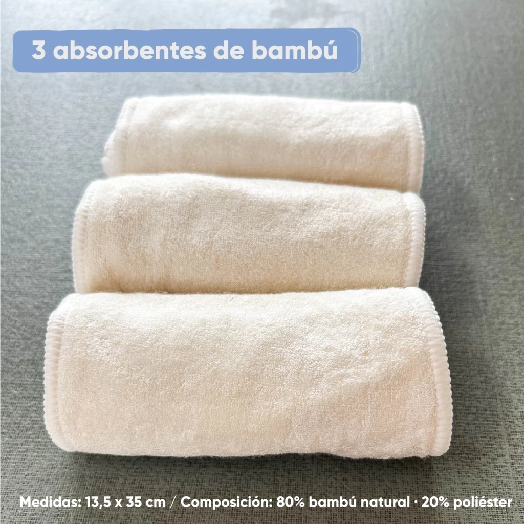 - 3 absorbentes de bambu: de alta absorción. Confeccionados con 80% bambú y 20% poliéster.